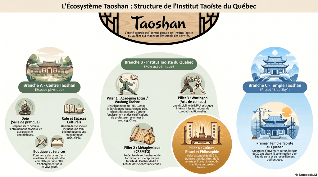 « Établir l’Institut Taoïste du Québec comme le centre de référence pour la transmission authentique de la sagesse, des arts et de la spiritualité taoïstes en Occident, permettant aux Québécois et aux Nord-Américains de renouer avec une voie spirituelle profonde et de s’éveiller à une conscience élargie au-delà du matérialisme moderne. »